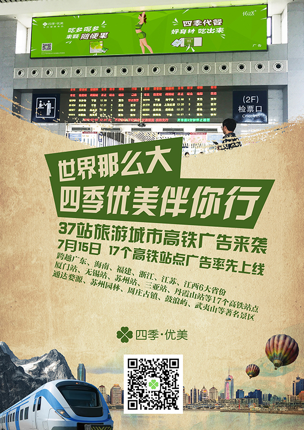 After Sijiyoumei’s impressive appearance in bus station billboards in Dalian, it takes a major step forward, putting LED ads on domestic high-speed rail stations in domestic tourist cities. By doing so, its ads will cover 12 major provinces and 37 sites, providing support for its brand-building.