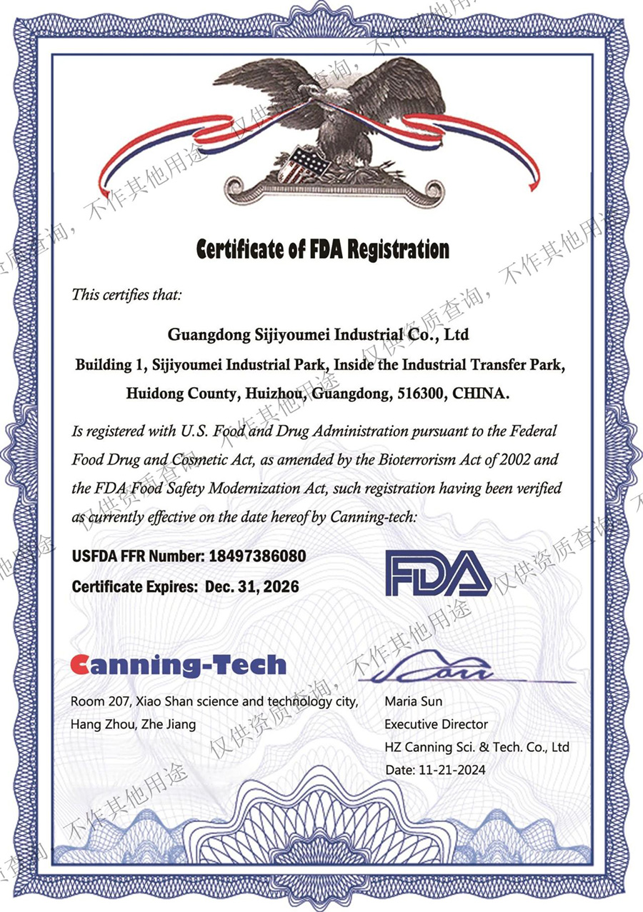 近日,廣東四季優(yōu)美實(shí)業(yè)有限公司(以下簡(jiǎn)稱“四季優(yōu)美”)已順利完成在美國(guó)食品藥品管理局(FDA)的注冊(cè)更新程序,注冊(cè)號(hào):18497386080。此次注冊(cè)更新,涵蓋了公司目前在售的所有產(chǎn)品類別,包括固體飲料、咖啡、水果及其制品、果凍等,標(biāo)志著四季優(yōu)美在國(guó)際市場(chǎng)的品質(zhì)管理和食品安全標(biāo)準(zhǔn)上又邁出了堅(jiān)實(shí)一步。